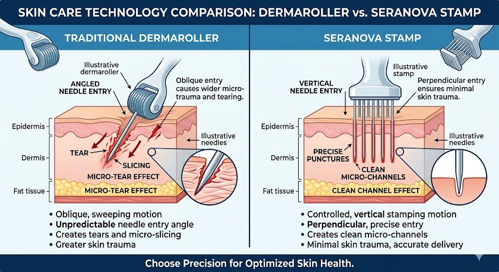 Taking the leap from topical creams to at-home micro-infusion can feel like a big step. However, when comparing the outdated, risky mechanics of traditional dermarollers to the sterile, precise, vertical stamping of the Seranova Micro Infusion System, the choice is clear.